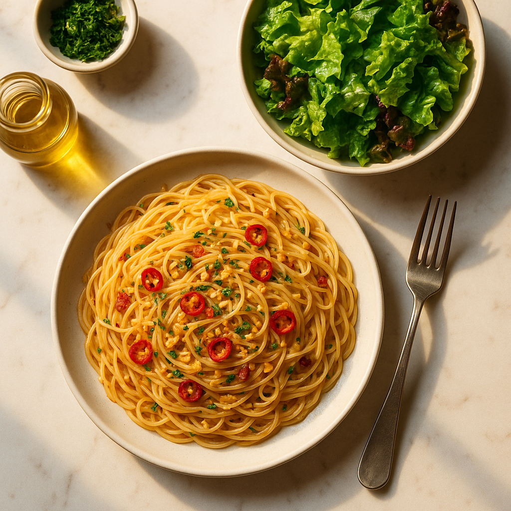 · Chili Garlic Angel Hair Pasta with Tangy Lettuce Salad