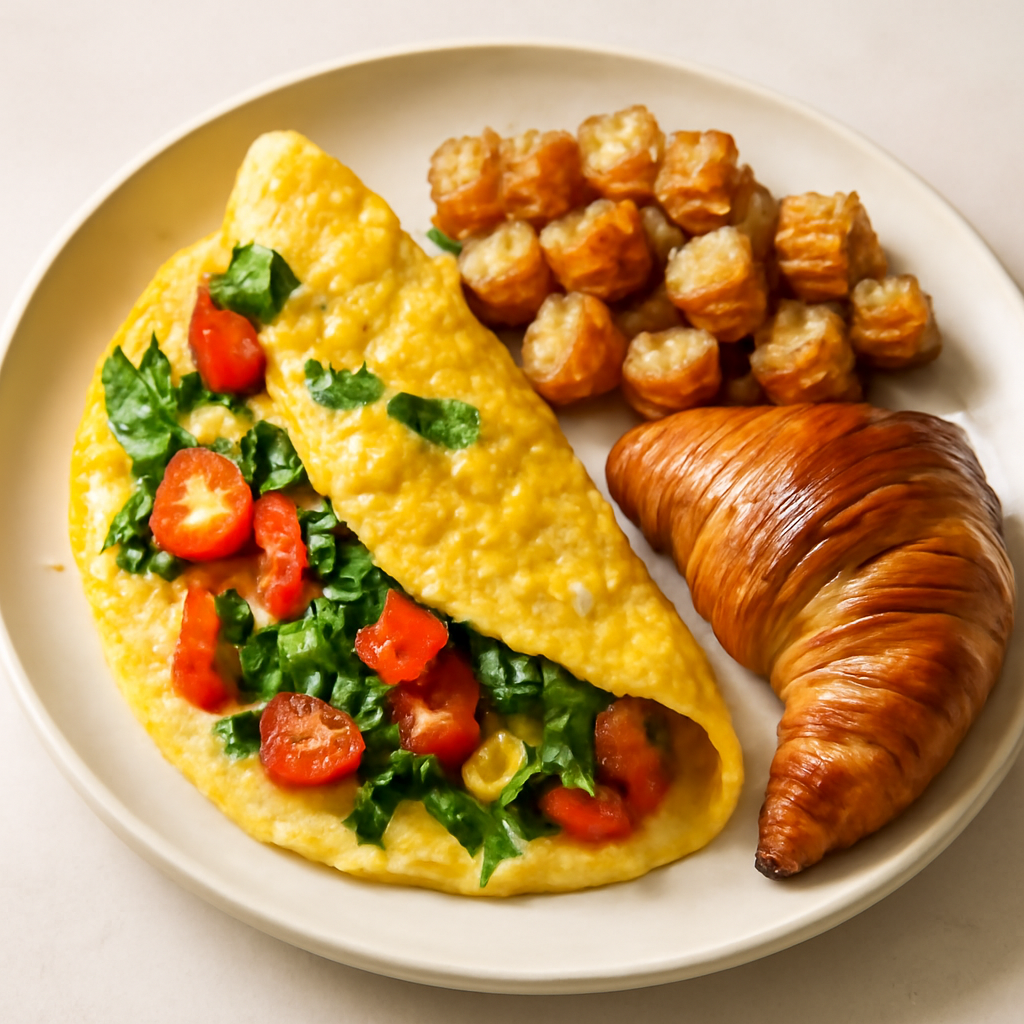· Hearty Veggie Omelette with Crispy Potatoes on a Flaky Croissant